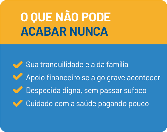 E quando a situação aperta de verdade, você conta com: assistência funeral completa, além de apoio financeiro super-rápido.